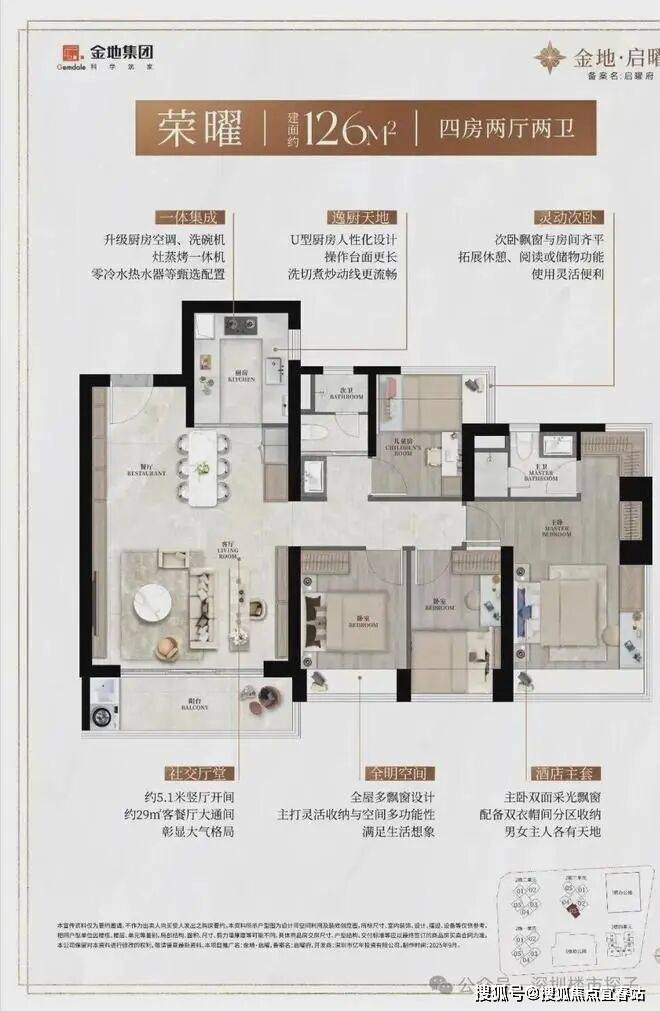 126㎡的4房2厅2卫,经典竖厅,5.1米客厅开间,29平LDKB一体,动静分区,四朝南。主卧270°飘窗,U型厨房,公卫干湿分离。得房率90%(含赠),客厅带5.1米阳台,西南向。