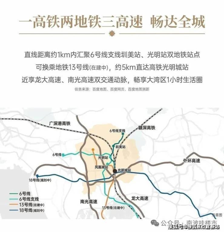 直线距离约1km内汇聚6号线支线圳美站、光明站双地铁站点,可换乘地铁13号线(在建中),约5km直达高铁光明城站,近享龙大高速、南光高速双交通动脉,畅享大湾区1小时生活圈