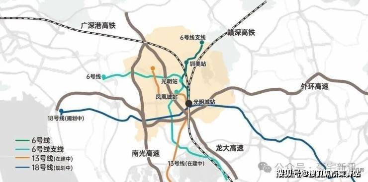 直线距离约1km内汇聚6号线支线圳美站、光明站双地铁站点可换乘地铁13号线(在建中),约5km直达高铁光明城站