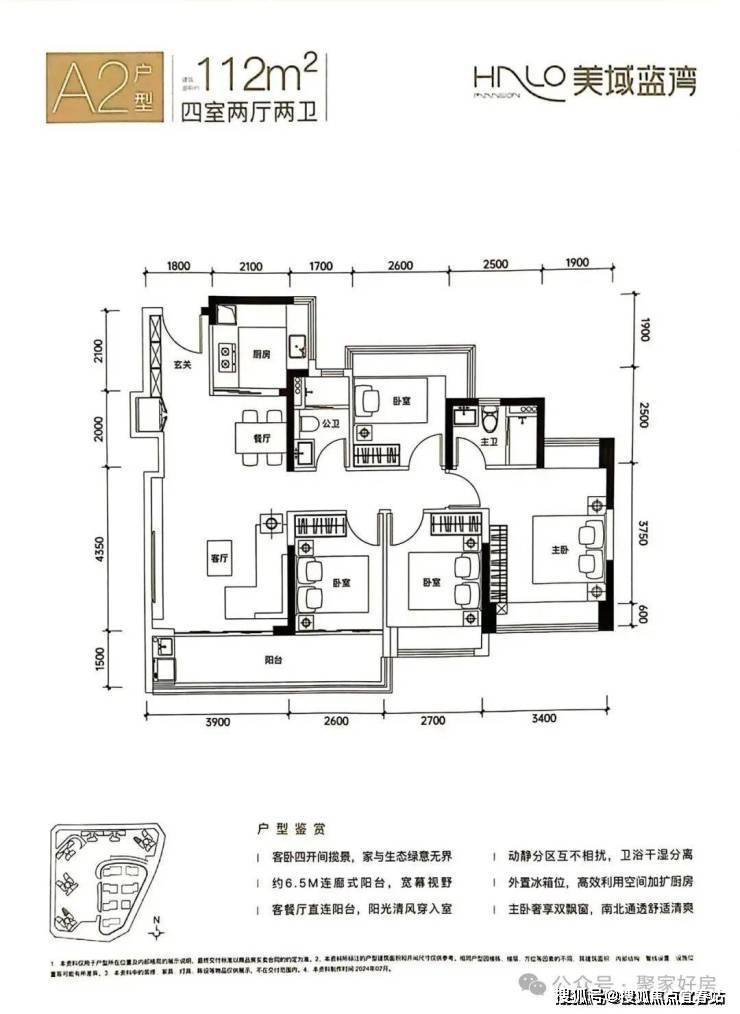 A2户型-112㎡的4房2厅2卫,设计的是竖厅格局,客厅连接次卧出阳台(有6.5米长),四开间朝南,S墙设计预留冰箱位,主卧双飘窗南北对流,U型厨房,得房率:80.12%(不含赠送),有西南或东北朝向。