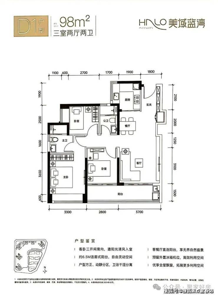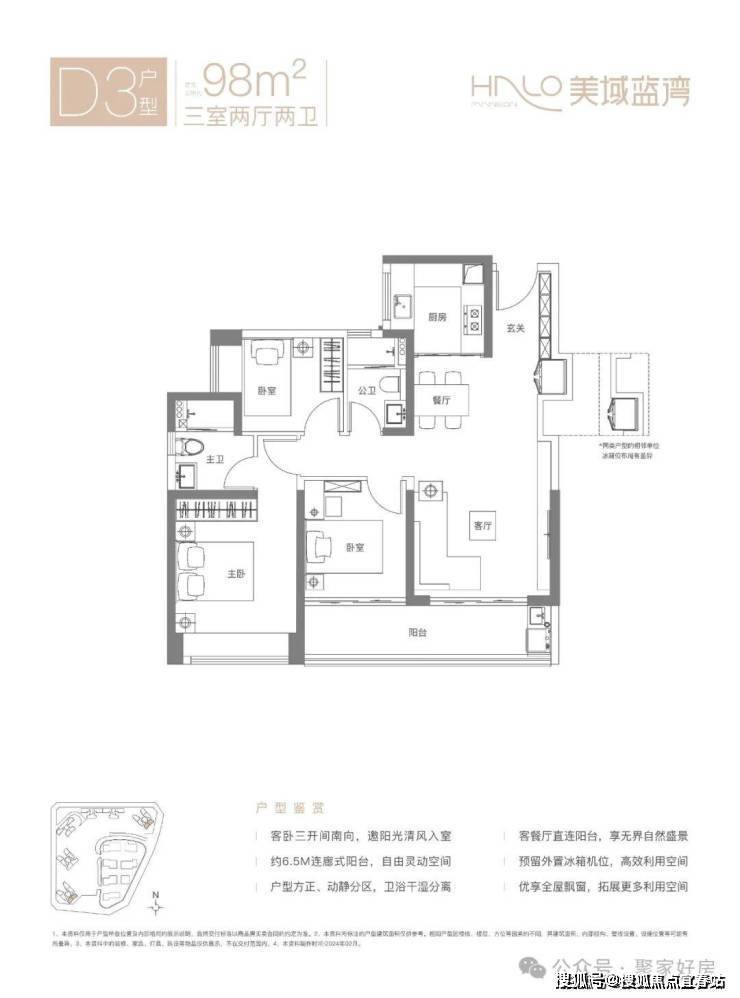 D1户型-98㎡的3房2厅2卫,设计的是竖厅格局,客厅连接次卧出阳台(有6.5米长),三开间朝南,S墙设计预留冰箱位,U型厨房,得房率:80.12%(不含赠送),有西南向或东北朝向。