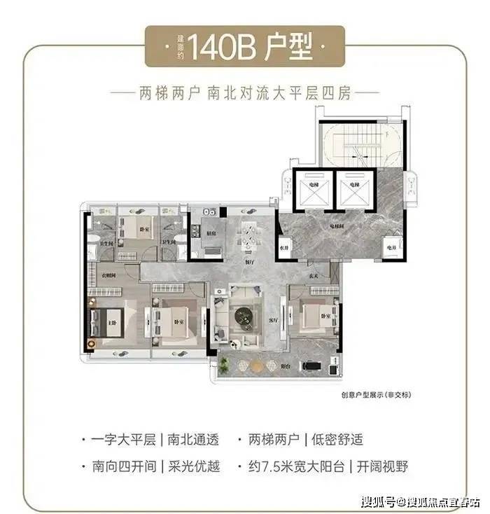 【2】7栋,建面约140平B,大四房|1字大平层南北通透|2梯2户专梯入户;