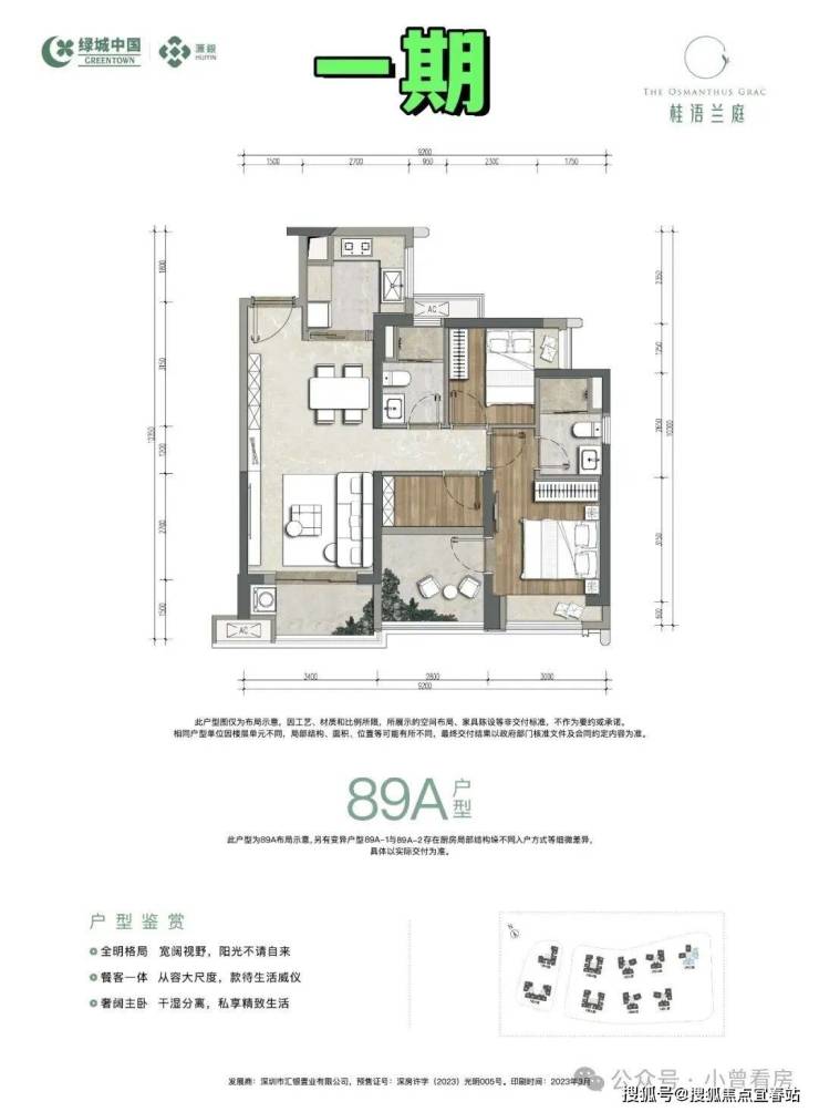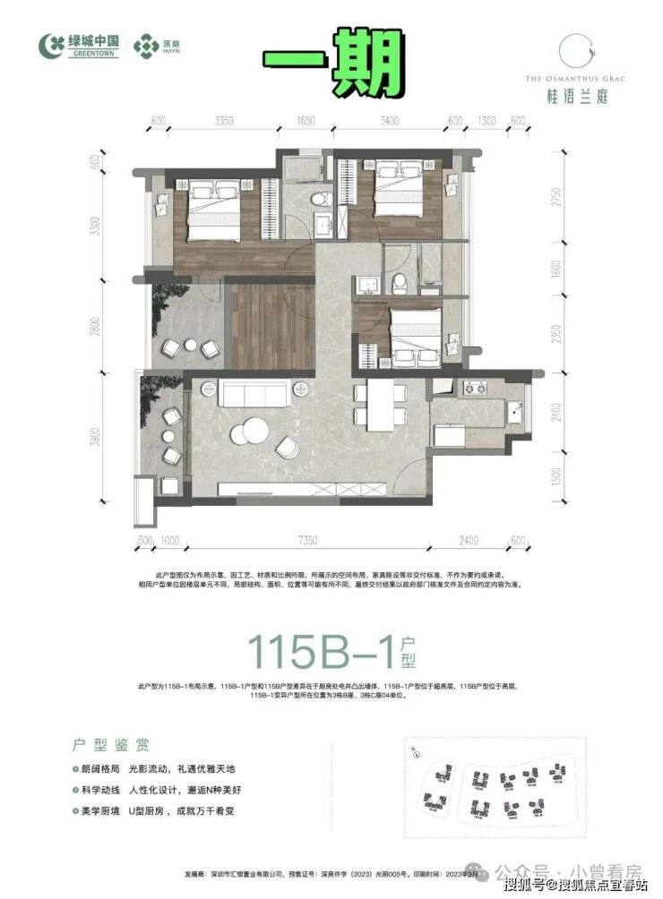 光明中心区,绿城桂语兰庭1期于2023年3月8日首推入市,本次推出3栋A/B/C/D/E座,共942套房源,面积有89㎡的3房2厅2卫,115-128㎡的4房2厅2卫户型,备案均价5万/㎡,备案单价4.07-5.93万/㎡,总价363-738万/套,计划在2025年7月份带精装交房,当时开盘是直接备案价出售。
