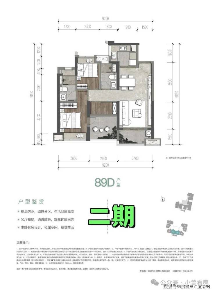 89㎡的3房2厅2卫(二期D户型),设计的是经典竖厅格局,餐客厅一体化,客厅3.4米开间,三开间朝南,3个卧室分别做到了3米/2.8米/2.3米的宽度,U型厨房,阳台1.5米进深,得房率:72.96%(不含赠送),西南朝向。