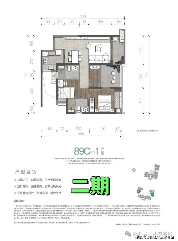 89㎡的3房2厅2卫(二期C-1户型),设计的是经典竖厅格局,餐客厅一体化,客厅3.4米开间,3个卧室分别做到了3米/2.8米/2.4米的宽度,U型厨房,阳台1.55米进深,得房率:72.96%(不含赠送),有西北或东南朝向。