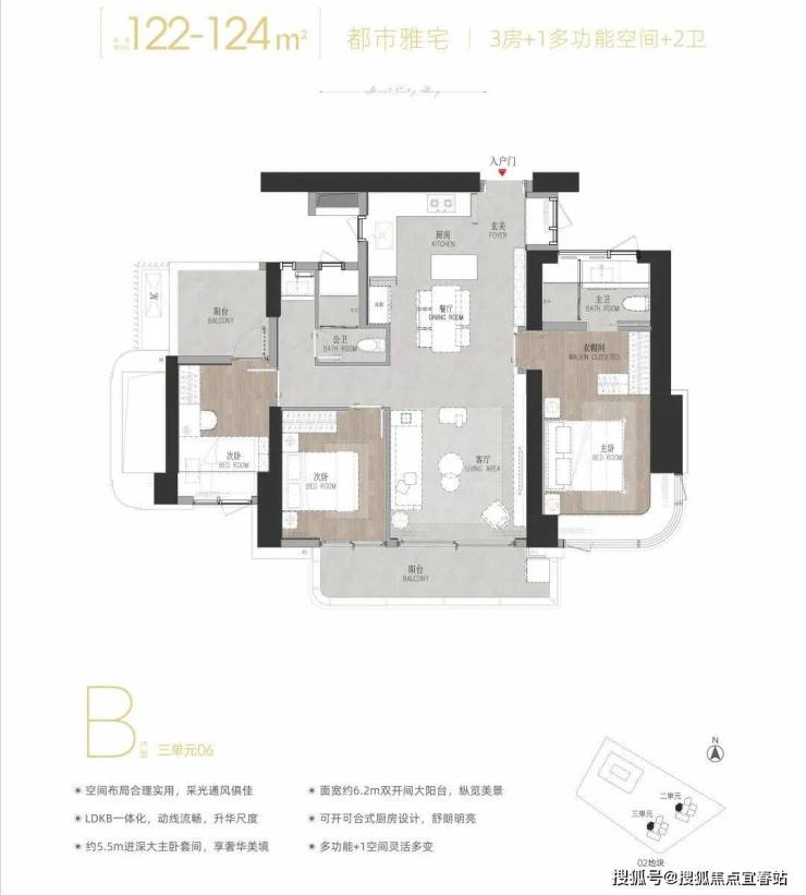 建面约122-124㎡3+1多功能空间:双龙抱珠户型,次卧带阳台。西北朝向看绿地公园及花园。