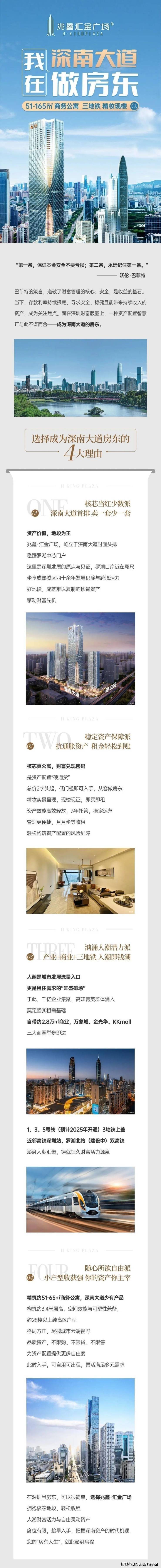 兆鑫汇金广场 雄踞深南大道主轴,主塔楼为约262米云端地标建筑,与地王大厦、平安金融中心等共同构筑深圳城市天际线。项目坐落于罗湖核芯腹地,总建面约28万㎡,汇集高端公寓、总裁公寓、写字楼、潮流商业、品质住宅为一体的地标综合体。