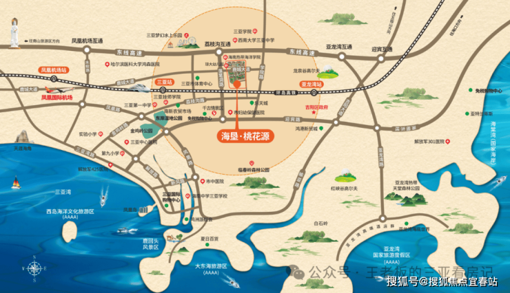 🚖【交通配套】项目位于三亚落笔洞路、鹿城大道两大城市主干道交汇处,距环岛高速荔枝沟互通仅约800米,三亚动车站约7公里,三亚凤凰机场约17公里。咫尺三亚繁华,家住城芯更自在。【商业配套】项目毗邻海南自贸港东岸总部CBD圈,中粮、中交、万华等多家大型企业项目聚集,荟聚乐天城、海旅超体、海旅免税城等醇熟商圈,集餐饮、购物、娱乐、总部办公等业态。咫尺,便是繁华世界。📚【教育配套】三亚城市文脉所在,三亚市重要学府,如海南热带海洋学院、三亚学院、海南华侨中学、三亚第一中学、荔枝沟小学、三亚第五小学、琼大国际生态幼儿园等全龄学府环伺,让孩子在学府文化氛围中成长,享受文儒浸润。【医疗配套】市妇幼保健医院、三亚市人民医院、三亚中心医院、301医院海南医院等三甲医院在侧,为您及家人的健康保驾护航。🦄【休闲配套】东岸湿地公园、半岭温泉、千古情大剧院、临春岭森林公园、龙泉谷高尔夫等休闲配套近藏。让您与人文自然来一次亲密接触。【社区配套】海垦·桃花源以组团式布局,构建精而美的园林盛景,宽而阔的楼体间距。融汇幼儿园、连廊商业、游泳池、东方会客厅、康体步道、阳光草坪、童趣乐园等全龄空间,让家人们在一方诗意天地邂逅桃源盛境,优享品质生活。