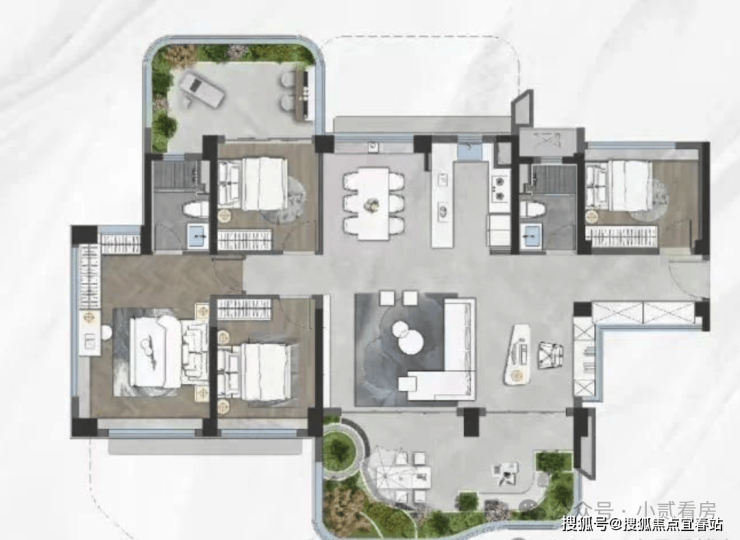 4+1房设计,南向4开间,约10.45米景观阳台,连通两个次卧,串联LDKG,空间尺度不言而喻。