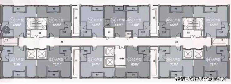 目前在售的商务公寓户型包括44㎡的1房、53-56㎡的1房以及63-65㎡和71㎡的2房2厅1卫。