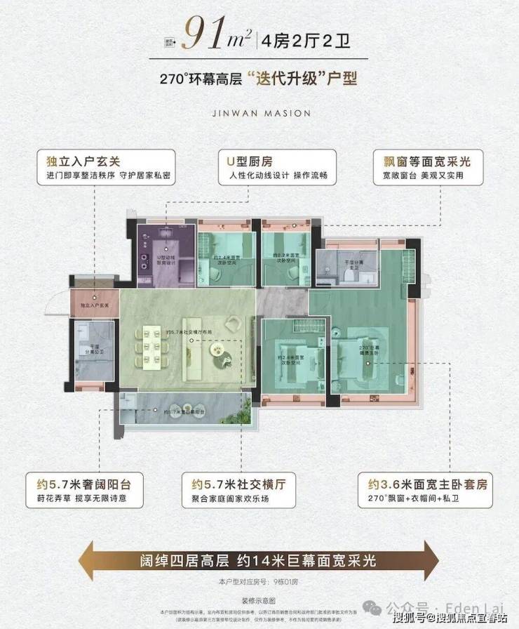 格局:14 米南向面宽、5.8 米横厅、南北对流、25㎡主卧套房