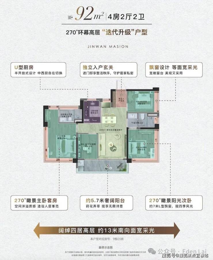 格局:三开间朝南、LDKG 一体化、5.7 米阳台、270° 飘窗