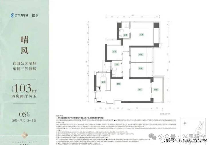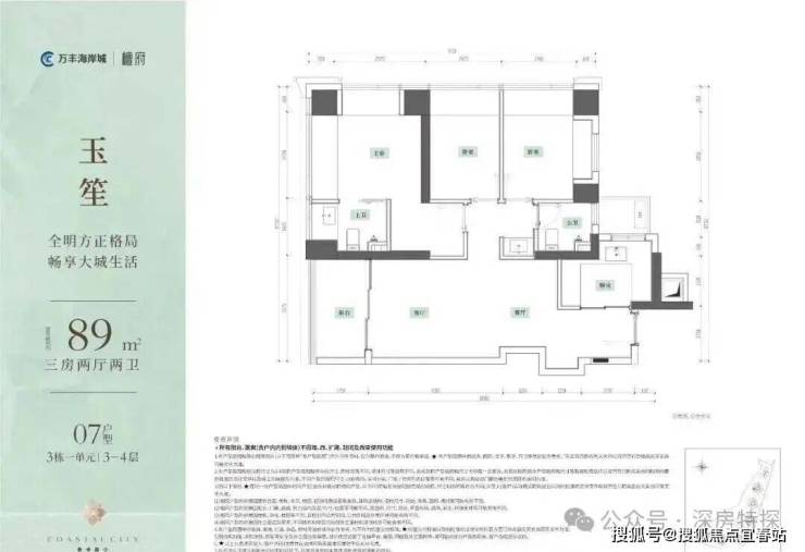 超16米东南采光面,阳台超7米宽;主卧进深4.5米,L型飘窗可270度景观。