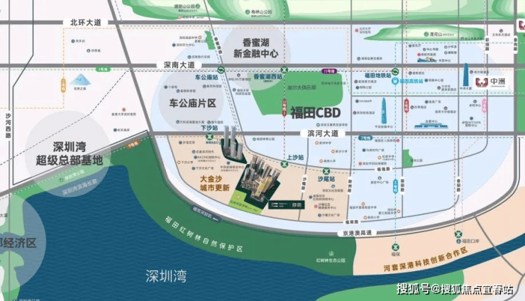 北邻香蜜湖新金融中心和车公庙2049未来之城,南接河套深港科创合作区