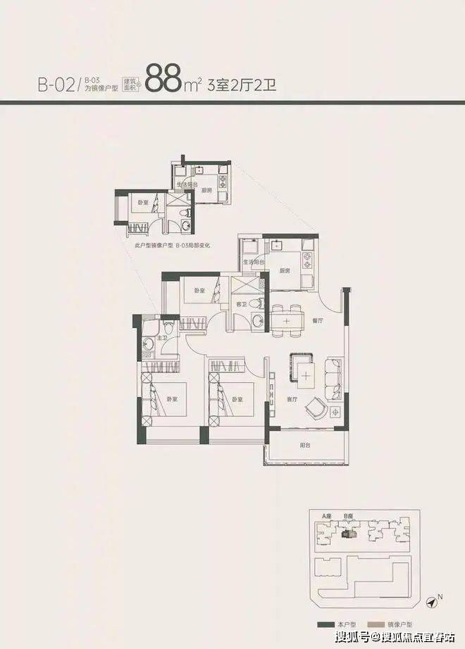 该户型是见惯的传统三房户型,亮点在于有双阳台设计,东南向10F以上视野越过前面的综合楼的裙楼会比较开阔。