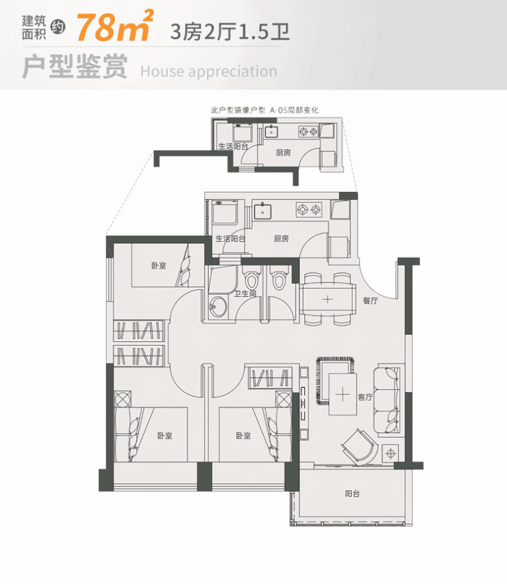 78㎡能做到三房+1.5卫+双阳台,功能性已经可以吊打科技园100㎡的新房。户型设计比较方正,1.5设计比较人性化,毕竟若三四口之家居住,多个马桶生活质素会提高很多。