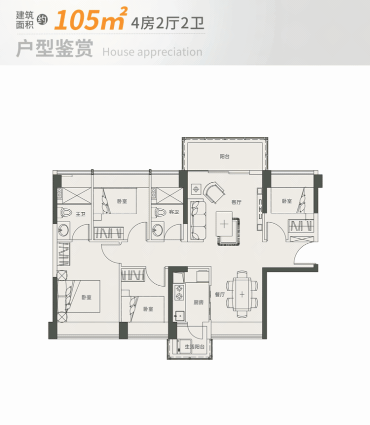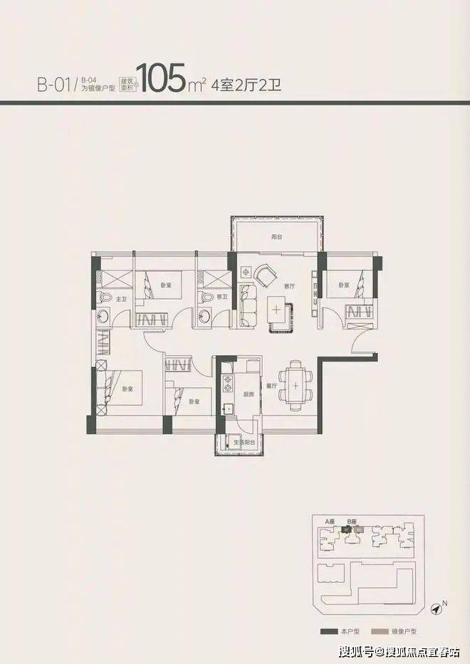 位于1B座是两梯四户的格局,尺度感不亚于目前市面上95㎡的产品。