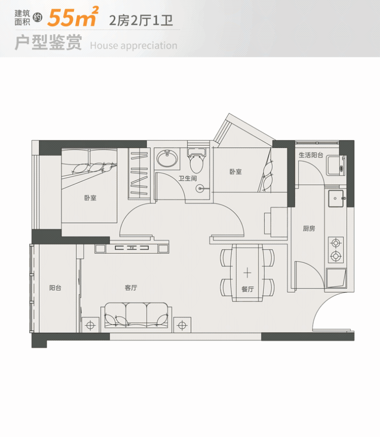 这种面积段产品如今在新盘市场上很少见到做到两房+两阳台的,对于小户型来说多个生活阳台是大加分项。