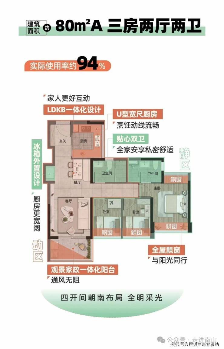 【80㎡三房两厅两卫】-A户型• 同等面积多一卫生间• 实际使用率约94%• 客餐厨一体化设计 动静分区