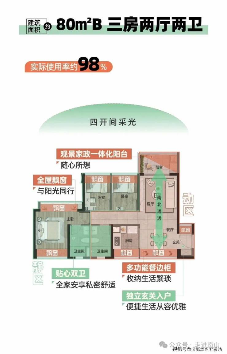 【80㎡三房两厅两卫】-B户型• 同等面积多一卫生间• 实际使用率约98%• 南北通透 动静分区