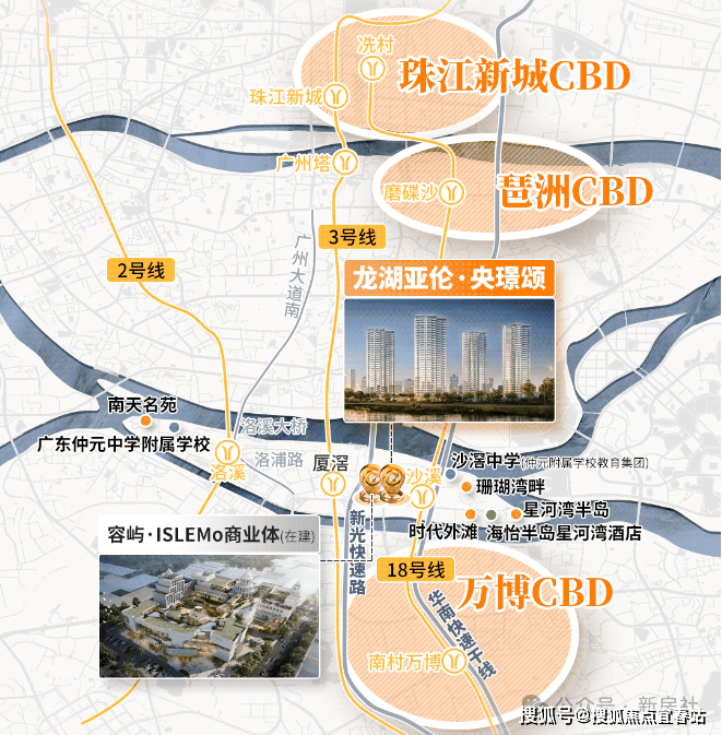 项目周边有双地铁,18号线+3号线可以直达珠江新城、琶洲等核心就业区,通勤便利。距离18号线沙溪地铁站约600-700米,18号线1站万博,2站琶洲,3站珠江新城。去3号线厦滘站有1公里左右,电鸡接驳比较方便。