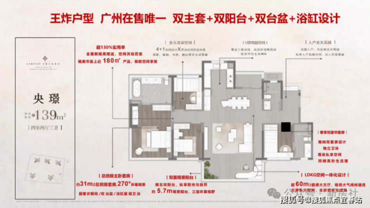【139m²】南北双阳台对流+揽园林瞰珠江景+双套房设计+置换首选 南向大面宽17.3米,近60㎡LDKG超大客厅设计,南5.7米、北2.7双阳台,约7米270°环幕观景窗,双套卧均 带独立衣帽间,塔尖人群奢享!