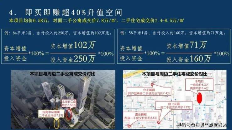 即买即赚:价格倒挂!例如:买入84㎡单位,资本立涨102万!本项目均价6.58万/㎡(送精装),附近二手公寓成交价约7.8万/㎡。