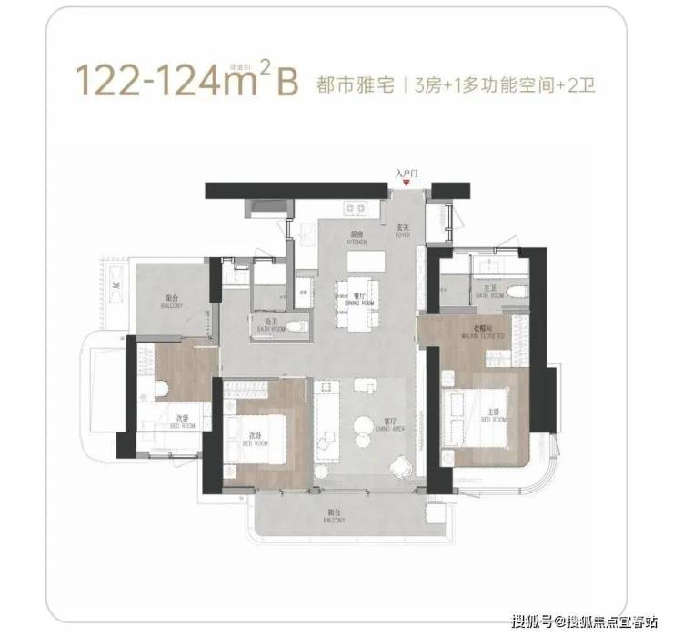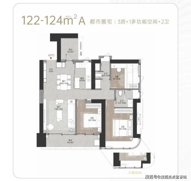 122-124㎡的4房2厅2卫,04/05户型,设计的是竖厅格局,客厅3.8米开间,LDKB一体化设计,三开间朝南,动静分区,分别做到了主卧13.78m²/次卧9.07m²/次卧8.1m²/次卧4.23m²(实测面积,去掉墙体),客厅连接次卧出6.7米长的观景大阳台,中西餐厨+岛台设计,公卫三段式干湿分离,得房率约71.7%(不含赠送),套内面积88.28m²,西南朝向。