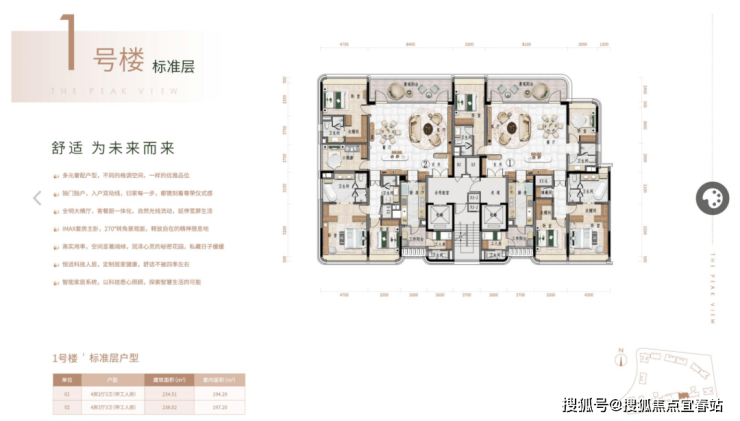建面约239㎡的户型拥有一个宽度为8米的阳台,而建面约242㎡的户型则拥有一个宽度为8.4米的阳台。这两个户型的实用率为83.6%。