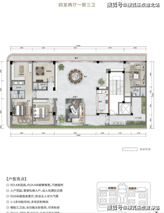 企业级大平层(A2、A4 户型):建筑面积约 276㎡,首层层高 5.6 米,2-6 层层高 3.4 米。一梯一户,拥有约 3.4 米层高、约 24.8 米超奢面宽和约 10 米超宽会客厅,门外有入户花园,私梯入户,仪式感十足。
