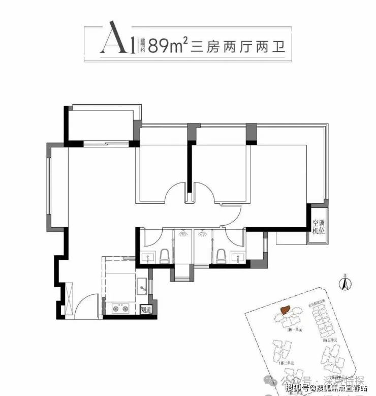 从流出的户型图可以看出,预计首推一期的1栋1单元,产品面积约89-112㎡ 3-4房,具体尺寸数据还没出,新规得房率还是值得期待的。其中89㎡ 3房2厅A1户型为常规经典竖厅,主卧有270度大飘窗
