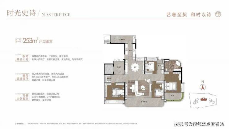253平是四房两厅两卫户型,竖厅设计,南北对流,阳台有10米长,特点是主卧的飘窗和主卫都是270度弧形采光面,视野采光一流。