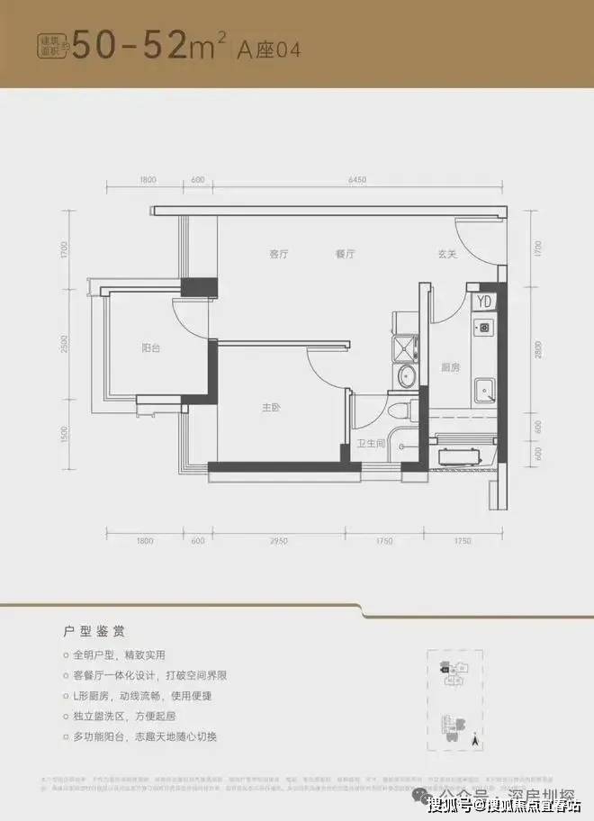 2、【户型】南山目前唯一在售50㎡户型,总价门槛低,虽然是一房一厅,阳台面积比较方正,可改小2居室,适合在南山工作的小两口,或三口之家。