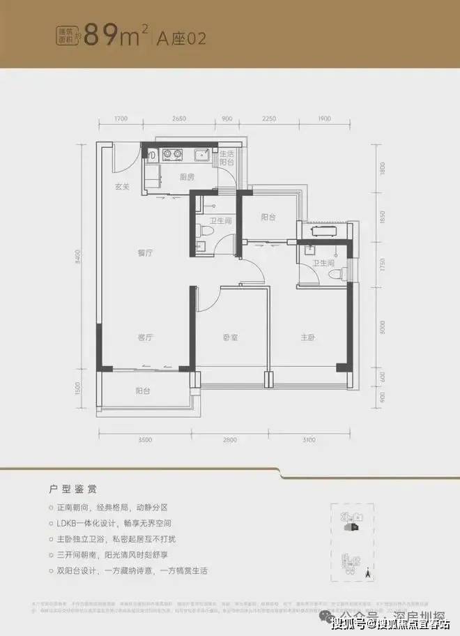 三开间正南朝向;LDKB一体化设计;动静分区。