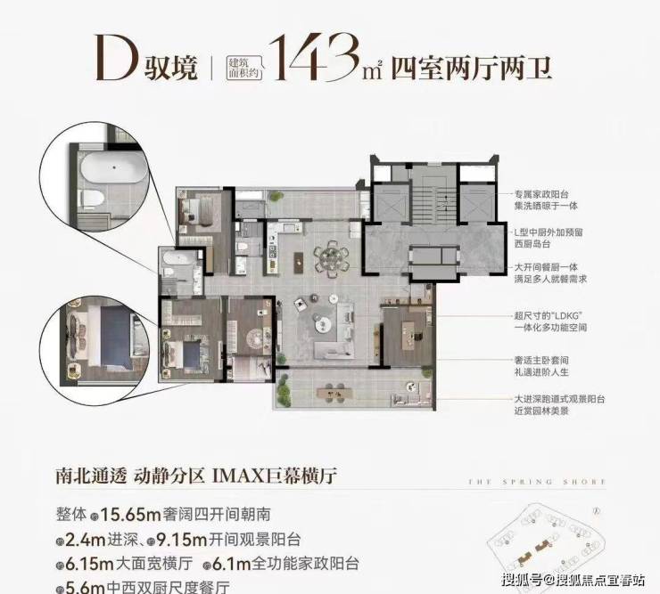 专属家政阳台集洗晒晾于一体,L 型中厨外加预留西厨岛台,大开间餐厨一体,满足多人就餐需求。超尺寸的 “LDKG” 一体化多功能空间,让生活更加便捷。奢适主卧套间,尽显品质生活。大进深跑道式观景阳台,可近赏园林美景。南北通透,动静分区,IMAX 巨幕横厅,整体 15.65m 奢阔四开间朝南,给人极致的居住享受。