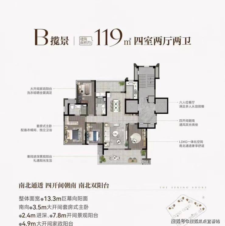 大开间家政阳台满足洗衣晾晒需求。六人位餐厅可让多人从容就餐。四开间朝南,通风采光绝佳。LDKG 一体化空间,让活动区域更宽敞。南北通透,奢享舒适生活。奢阔进深景观阳台,尽情享受阳光。南向 3.5m 大开间套房式主卧,还有 2.4m 进深、7.8m 开间景观阳台以及 4.9m 大开间家政阳台,整体面宽 13.3m 巨幕向阳面,居住体验超棒。