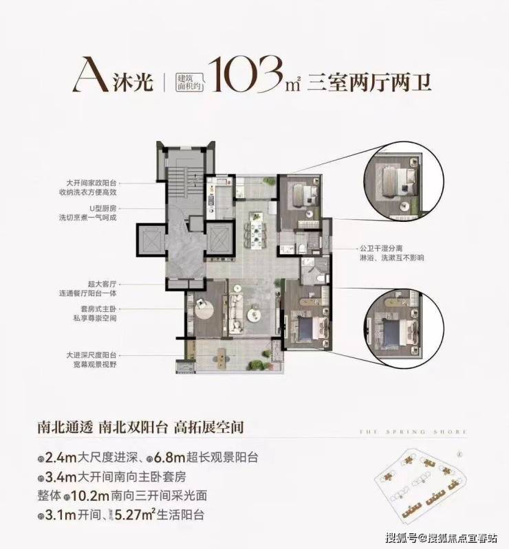 这个户型收纳洗衣便捷高效,设有大开间家政阳台。厨房洗切烹煮一气呵成,公卫干湿分离,互不影响。客厅与餐厅连通,空间开阔。套房式主卧,搭配大进深尺度阳台,拥有宽幕观景视野。南北通透,南北双阳台设计,拓展空间大。南向主卧套房开间 3.4m,还有 2.4m 大尺度进深、6.8m 超长观景阳台,整体 10.2m 南向三开间采光面,阳光满满。