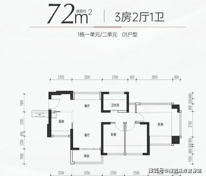 72㎡的3房2厅1卫,设计的是竖厅南北通透格局,进门独立玄关,LDKB一体化,主卧270°飘窗设计,L型厨房,卫生间干湿分离,得房率约100%(包含赠送),阳台主朝东北向。