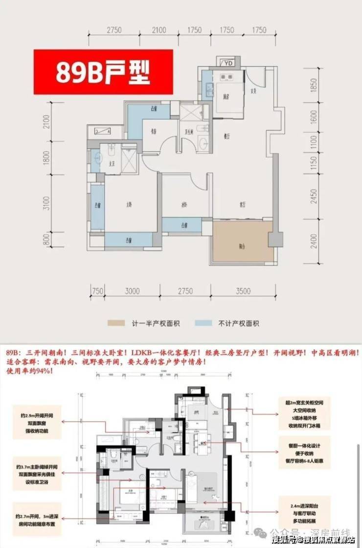89㎡的3房2厅2卫,B户型,设计的是经典竖厅格局,进门入户玄关,客厅3.5米开间,LDKB一体化,动静分区,三开间朝南,S墙设计预留冰箱卡槽位,主卧+1个次卧270°飘窗,3个卧室分别做到了主卧15.1㎡/次卧8.52㎡/次卧7.77㎡(包含墙体飘窗),U型厨房,卫生间干湿分离,得房率约:77.39%(不含赠送),西南朝向。赠送面积16.96㎡,加上赠送得房率96.84%。