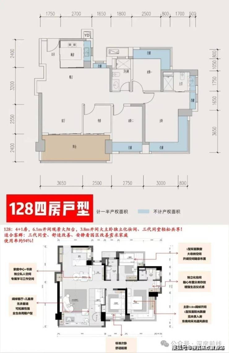 128㎡的4房2厅2卫,设计的是经典竖厅格局,进门入户玄关,客厅3.65米开间,LDKB一体化,S墙设计预留冰箱卡槽位,四开间朝南,动静分区,主卧+1个次卧270度大飘窗,客厅连接次卧出6.15米长大阳台,4个卧室分别做到了主卧20.14㎡/次卧11.28㎡/次卧10.58㎡/次卧6.37㎡(包含墙体飘窗),U型厨房,卫生间干湿分离,得房率约:77.39%(不含赠送),东南朝向。赠送面积21.54㎡,加上赠送得房率94.45%。