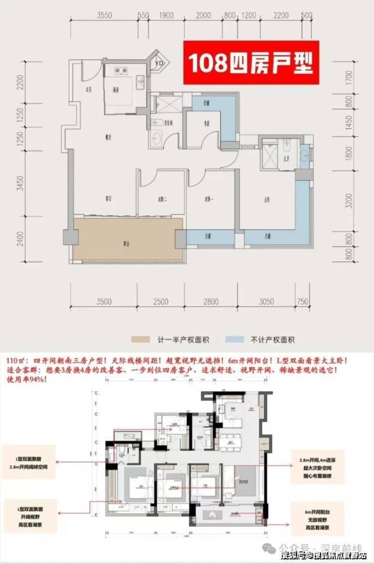108㎡的4房2厅2卫,A户型,设计的是经典竖厅格局,进门入户玄关,客厅3.45米开间,LDKB一体化,S墙设计预留冰箱卡槽位,四开间朝南,动静分区,主卧+1个次卧270度大飘窗,客厅连接次卧出6米长大阳台,4个卧室分别做到了主卧16.4㎡/次卧11.2㎡/次卧7.84㎡/次卧6.25㎡(包含墙体飘窗),U型厨房,卫生间干湿分离,得房率约:77.39%(不含赠送),西南朝向。赠送面积18.4㎡,加上赠送得房率94.04%。