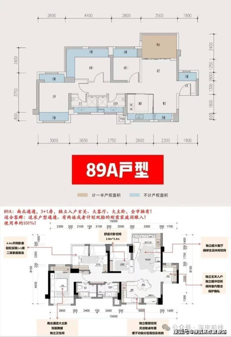 89㎡的3+1房2厅2卫,A户型,设计的是竖厅南北通透格局,进门入户玄关,客厅3.5米开间,客餐厅分离设计,五开间朝南,主卧南北通透双飘窗,3个卧室分别做到了主卧15.73㎡/次卧14.08㎡/次卧8.96㎡(包含墙体飘窗),U型厨房,卫生间干湿分离,得房率约:77.39%(不含赠送),阳台主朝东北向。这次推出最靓的户型可以改4房,赠送面积24.5㎡,加上赠送得房率高达104.87%。