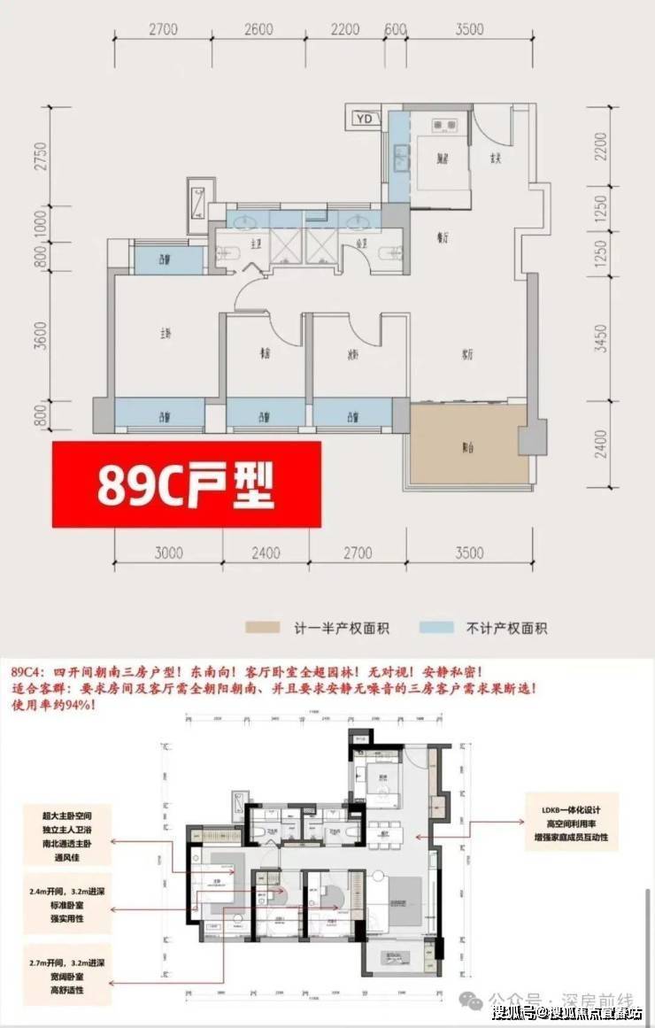 89㎡的3房2厅2卫,C4户型,设计的是竖厅格局,进门入户玄关,客厅3.5米开间,LDKB一体化,动静分区,三开间朝南,S墙设计预留冰箱卡槽位,主卧南北通透设计,3个卧室分别做到了主卧14.5㎡/次卧8.37㎡/次卧7.44㎡(包含墙体飘窗),U型厨房,卫生间干湿分离,得房率约:77.39%(不含赠送),东南朝向。赠送面积18.88㎡,加上赠送得房率98.29%。