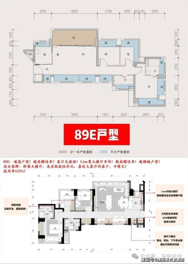 89㎡的3房2厅2卫,E1户型,设计的是横厅南北通透格局,进门入户玄关,客餐厅5.6米开间,LDKB一体化设计,客餐厅出11㎡的大阳台,主卧+1个次卧双飘窗设计,全屋12面飘窗,3个卧室分别做到了主卧15.1㎡/次卧7.83㎡/次卧6.96㎡(包含墙体飘窗),L型灵动式厨房,卫生间干湿分离,得房率约:77.39%(不含赠送),阳台主朝西北向。也是可以改4房的格局,赠送面积24㎡,加上赠送得房率104.44%。