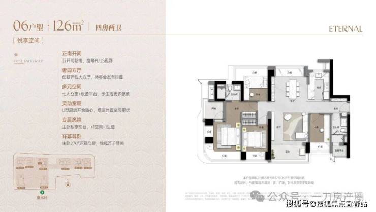 项目123㎡产品,实现了4房空间构造,同时还保证户型南北通透同时4个空间为南向开启,产品构造上通过凸窗延展了景观面,是市场上极少见的南向优质产品。