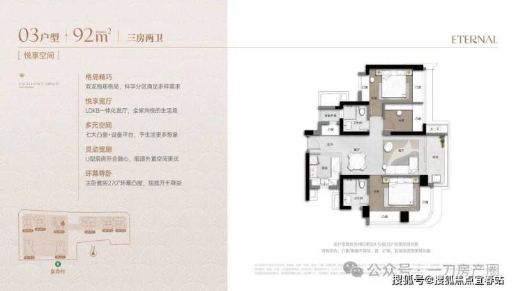其中,项目最小面积92㎡产品,做到了双龙抱珠的户型设计,充分将户型内部空间进行展开,优化动静分区的同时,还实现了270°的小面积奢阔主卧景观。
