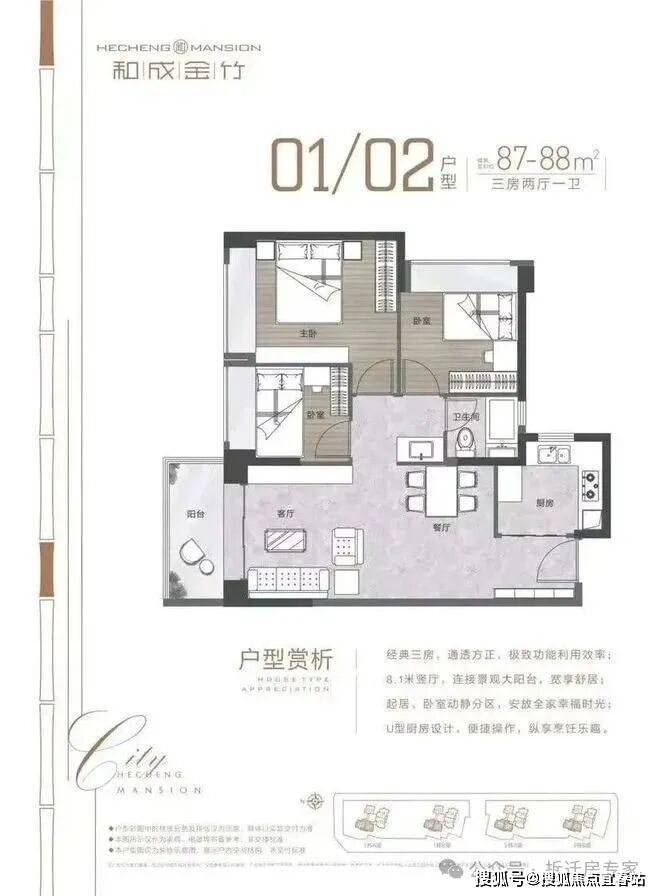 88㎡三房一卫:单价5.9-6.3万/㎡,备案总价522-550万;