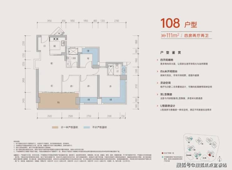108-110㎡的4房2厅2卫,A户型,设计的是经典竖厅格局,进门入户玄关,客厅3.45米开间,LDKB一体化,S墙设计预留冰箱卡槽位,四开间朝南,动静分区,主卧+1个次卧270度大飘窗,客厅连接次卧出6米长大阳台,分别做到了主卧16.4㎡/次卧11.2㎡/次卧7.84㎡/次卧6.25㎡(包含墙体飘窗),U型厨房,卫生间干湿分离,得房率约:77.3-77.39%(不含赠送),西南朝向。赠送面积18.4㎡,加上赠送得房率94.04%。