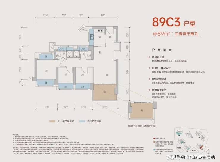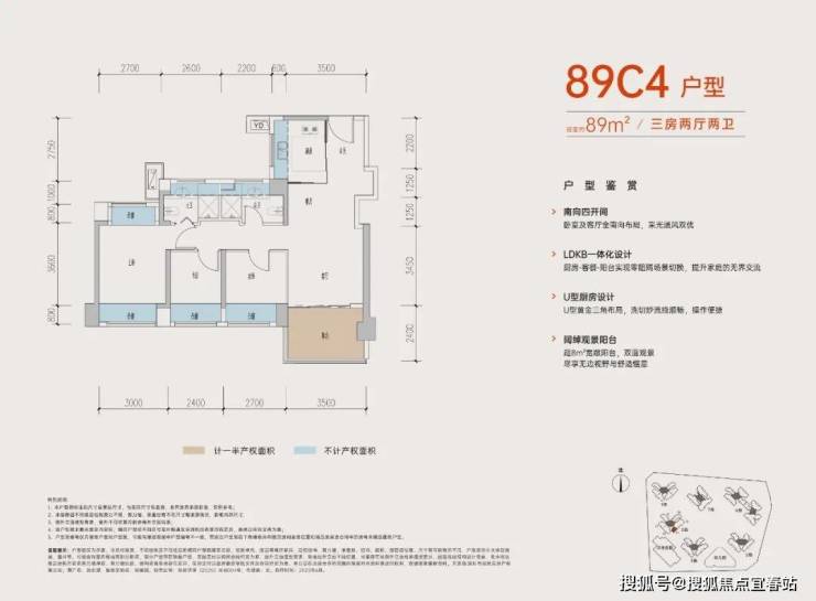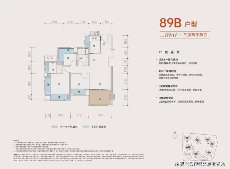 89㎡的3房2厅2卫,B户型,设计的是经典竖厅格局,进门入户玄关,客厅3.5米开间,LDKB一体化,动静分区,三开间朝南,S墙设计预留冰箱卡槽位,主卧+1个次卧270°飘窗,分别做到了主卧15.1㎡/次卧8.52㎡/次卧7.77㎡(包含墙体飘窗),U型厨房,卫生间干湿分离,得房率约:77.39%(不含赠送),西南朝向。赠送面积16.96㎡,加上赠送得房率96.84%。