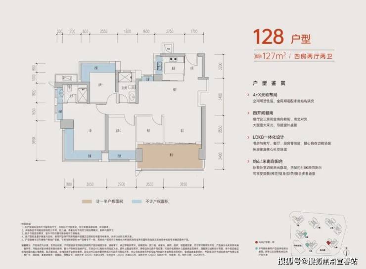 126-128㎡的4房2厅2卫,设计的是经典竖厅格局,进门入户玄关,客厅3.65米开间,LDKB一体化,S墙设计预留冰箱卡槽位,四开间朝南,动静分区,主卧+1个次卧270度大飘窗,客厅连接次卧出6.15米长大阳台,分别做到了主卧20.14㎡/次卧11.28㎡/次卧10.58㎡/次卧6.37㎡(包含墙体飘窗),U型厨房,卫生间干湿分离,得房率约:77.3-77.39%(不含赠送),东南朝向。赠送面积21.54㎡,加上赠送得房率94.45%。